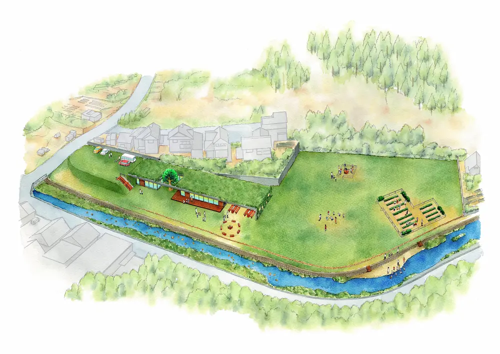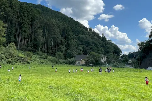 この地にみぎわは約4000㎡(1300坪ほど)の広さの土地を所有しています。子どもたちは野原を駆け回って遊んだり、草に寝転がって空にうかぶ雲をながめたり、はたまたバッタやカマキリを追いかけたり、隣を流れる小川でサワガニをつかまえたりと、自然遊びを心ゆくまで楽しむことができます。