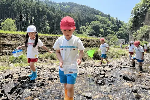 普段の水量は、子どもたちが川遊びをするのにちょうどよく、澄んだ水にはメダカやカワムツが泳いでいたり、石の下にはサワガニがいたり、子どもたちにとってまたとない川遊びの場所です。